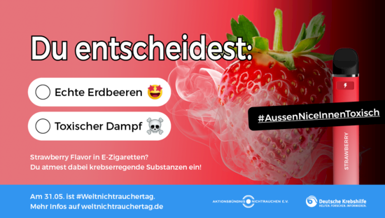 Das Motiv des ABNR zum Weltnichtrauchertag imitiert einen Social Media Post und stellt die Betrachter vor die Wahl zwischen echten Erdbeeren und toxischem Dampf. Der Appell ist klar: Entscheide dich für deine Gesundheit und gegen die E-Zigarette, denn der fruchtige Dampf enthält krebserregende Substanzen. Interessierte finden das Motiv zum Weltnichtrauchertag als Plakat sowie als Banner in unterschiedlichen Formaten und als animierten Clip zusammen mit weiteren Informationsmaterialien zum Herunterladen oder Bestellen unter: www.weltnichtrauchertag.de, www.krebshilfe.de/weltnichtrauchertag und www.dkfz.de.